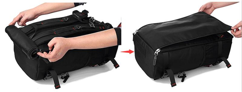 • Balo còn đi kèm với tấm phủ bạt phía sau lưng để giấu dây đeo vai khi không sử dụng hoặc chắn nước, khi cần dùng dây đeo có thể cuộn lên trên đầu.